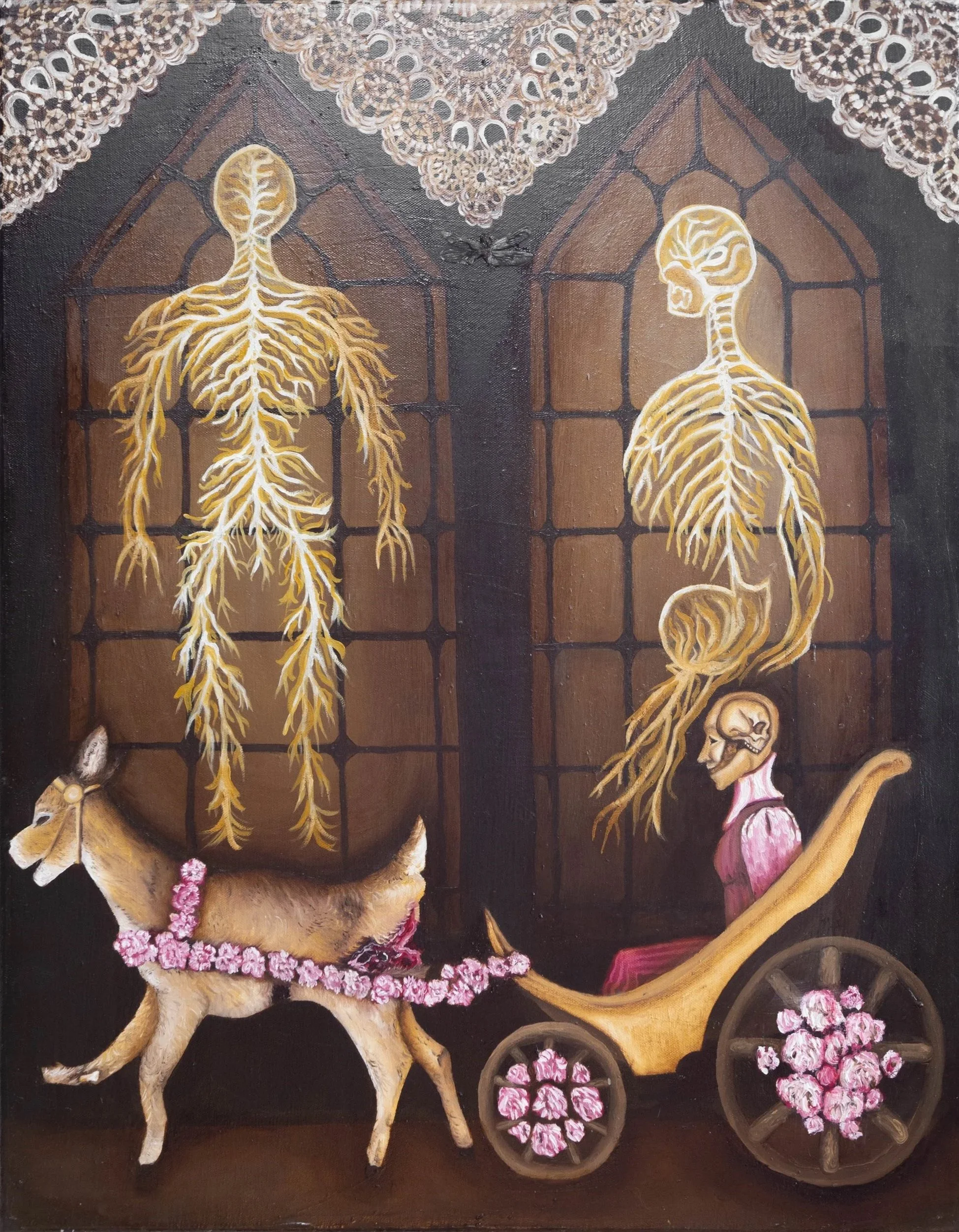 Hayla Hay’s paintings draw from Christian symbolism, mythological iconography, and folklore. By blending traditional allegories, she seeks to recreate visions that are intimate, strange, and resolutely human—using what was written before us to craft a sense of personal belonging.